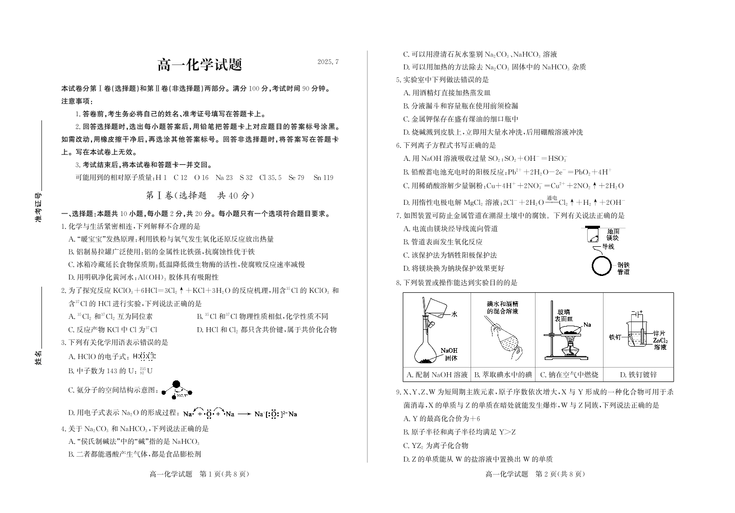 高一化学+答案--山东省德州市2024-2025学年高一下学期期末考试