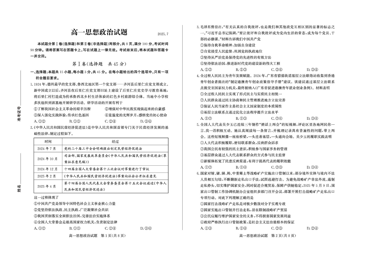 高一政治--山东省德州市2024-2025学年高一下学期期末考试