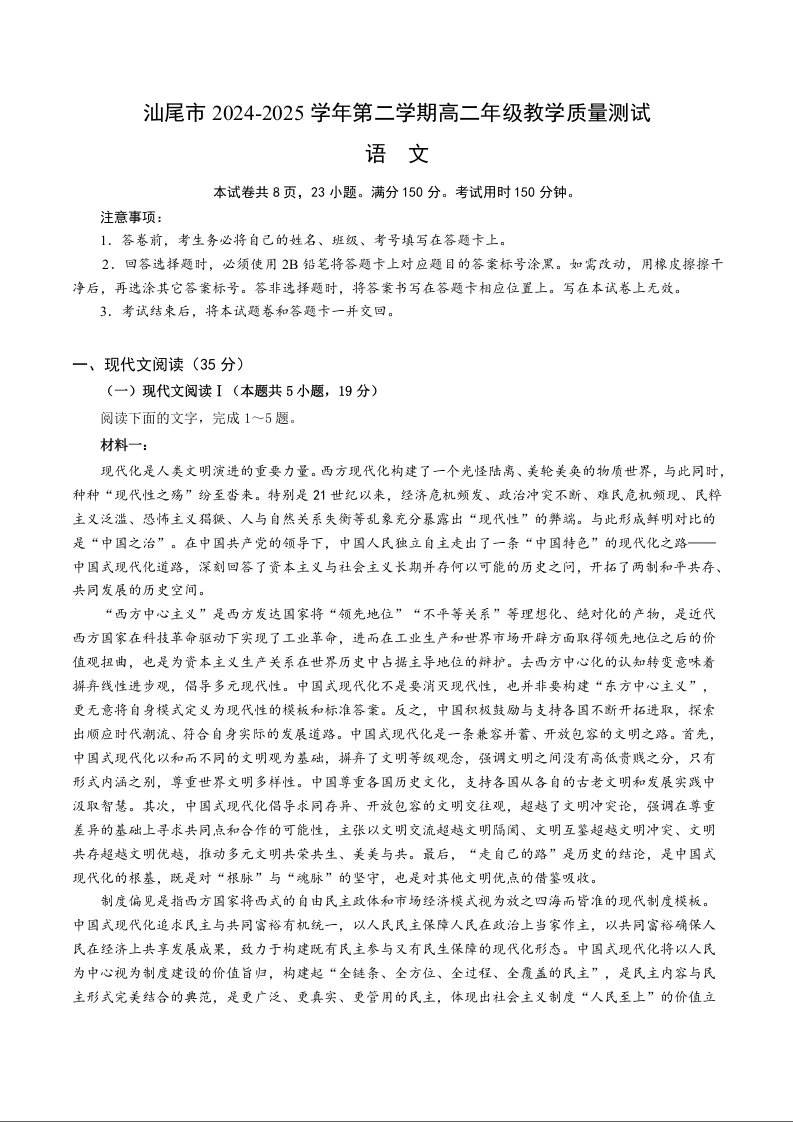 高二语文--广东省汕尾市2024-2025学年高二下学期期末教学质量监测