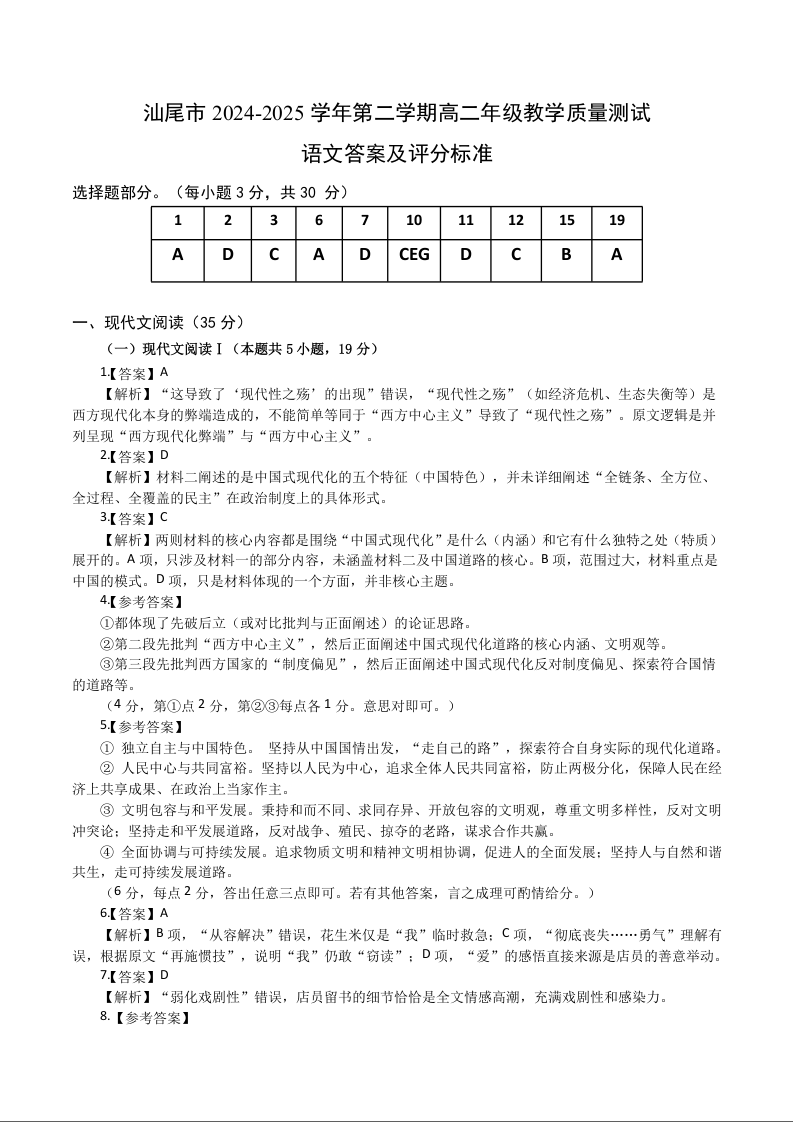 高二语文答案--广东省汕尾市2024-2025学年高二下学期期末教学质量监测