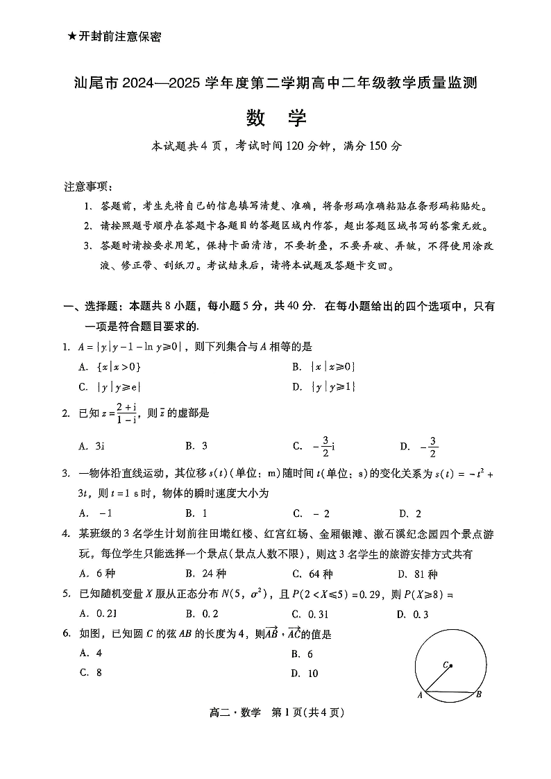 高二数学--广东省汕尾市2024-2025学年高二下学期期末教学质量监测