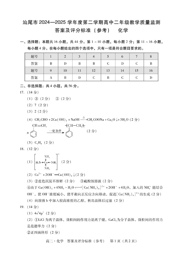 高二化学答案--广东省汕尾市2024-2025学年高二下学期期末教学质量监测