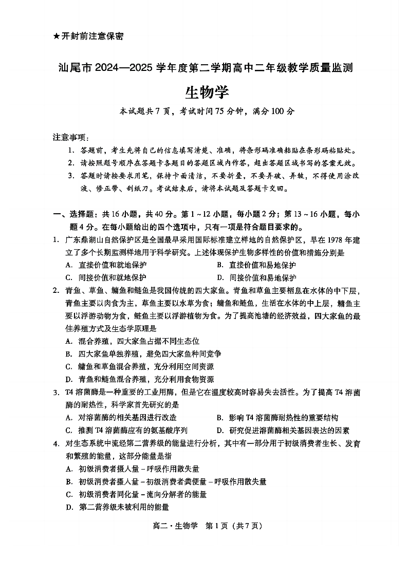 高二生物--广东省汕尾市2024-2025学年高二下学期期末教学质量监测