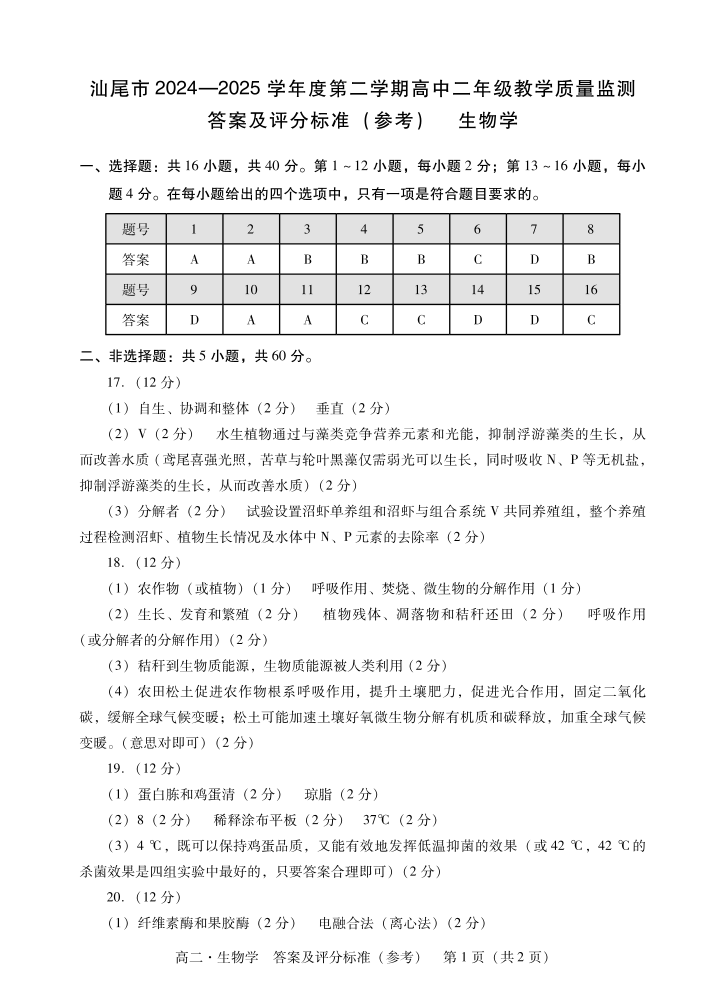 高二生物答案--广东省汕尾市2024-2025学年高二下学期期末教学质量监测
