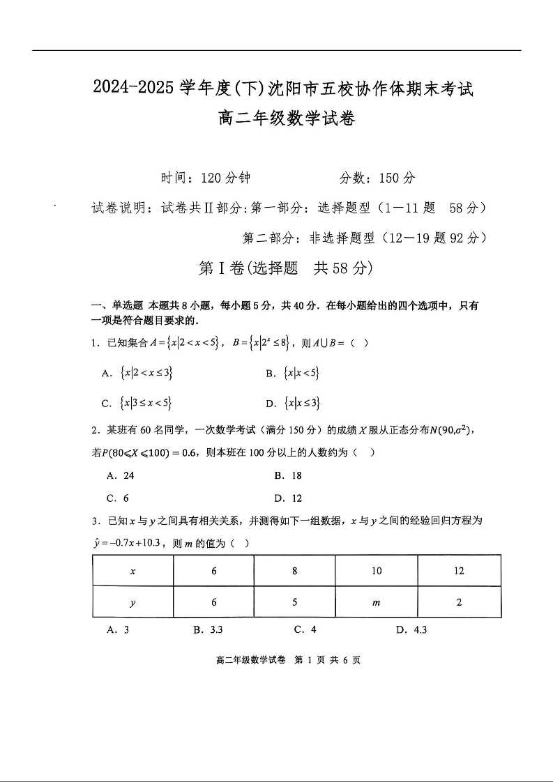 高二数学--辽宁省沈阳市五校协作体2024-2025学年度高二下学期期末考试
