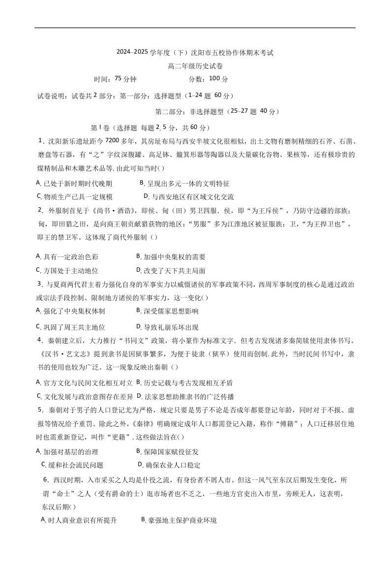 高二历史+答案--辽宁省沈阳市五校协作体2024-2025学年度高二下学期期末考试