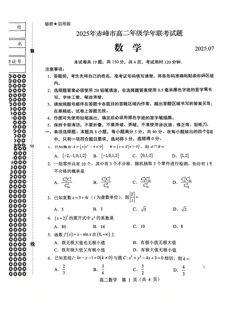 高二数学--内蒙古赤峰市2024-2025学年高二下学期期末联考