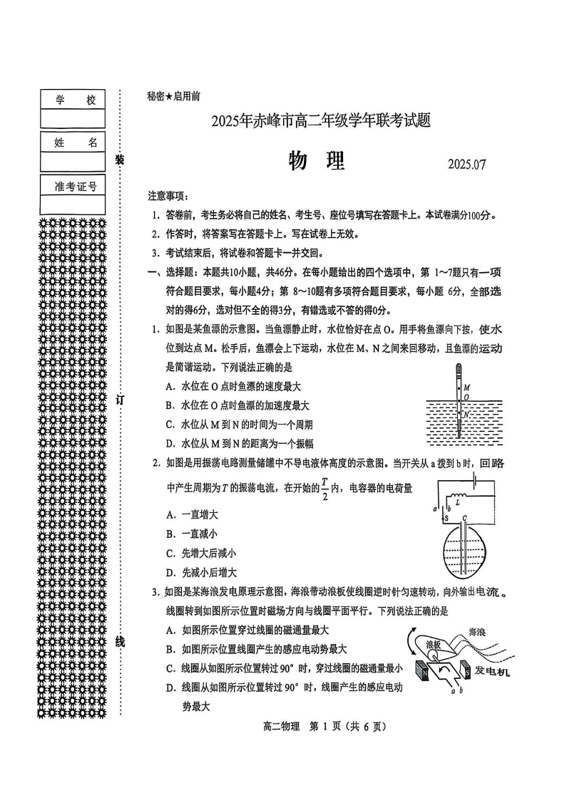 高二物理--内蒙古赤峰市2024-2025学年高二下学期期末联考