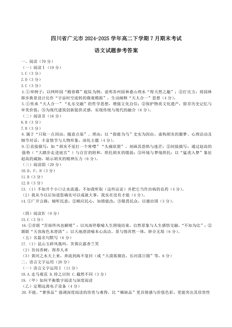 高二语文答案--四川省广元市2024-2025学年高二下学期期末教学质量监测