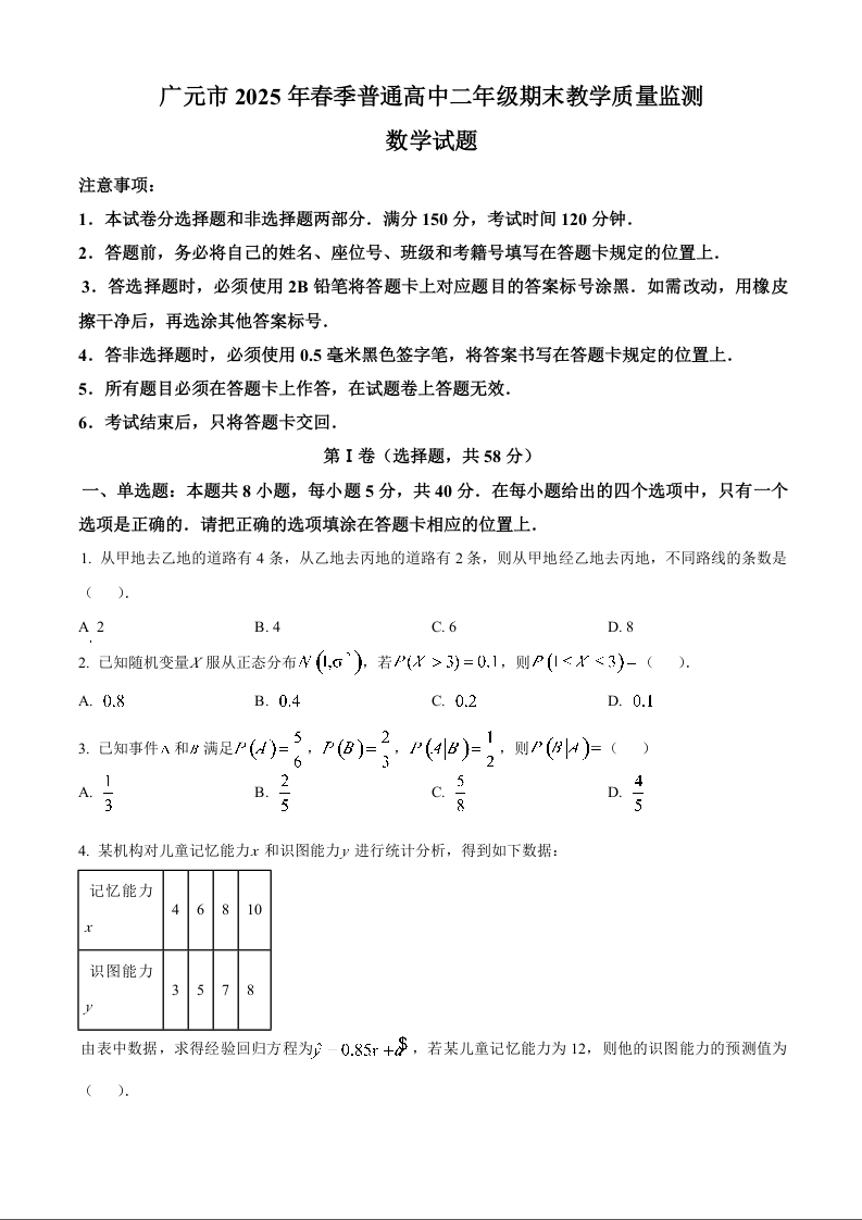 高二数学+答案--四川省广元市2024-2025学年高二下学期期末教学质量监测
