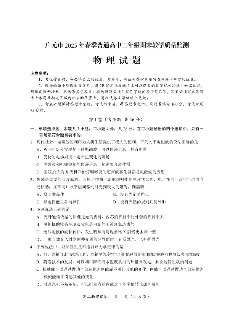 高二物理+答案--四川省广元市2024-2025学年高二下学期期末教学质量监测