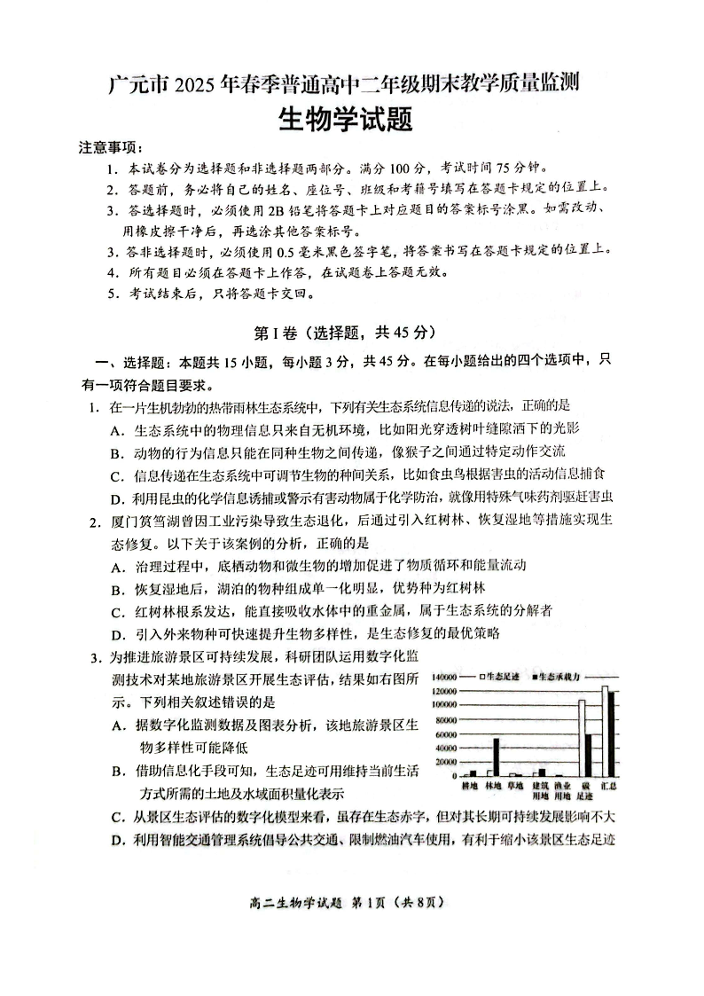 高二生物--四川省广元市2024-2025学年高二下学期期末教学质量监测