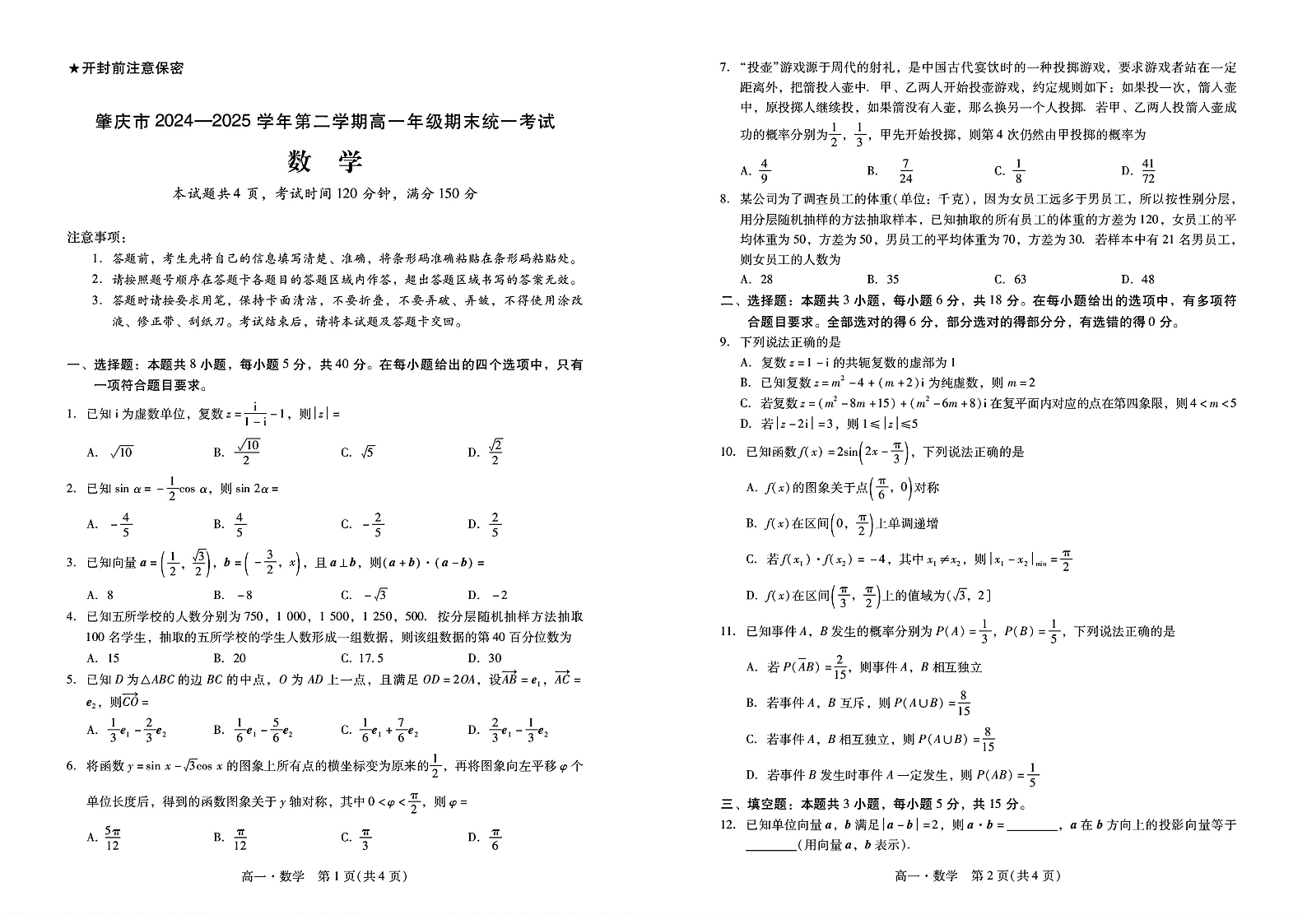高一数学+答案--广东省肇庆市2024-2025学年高一下学期期末考试