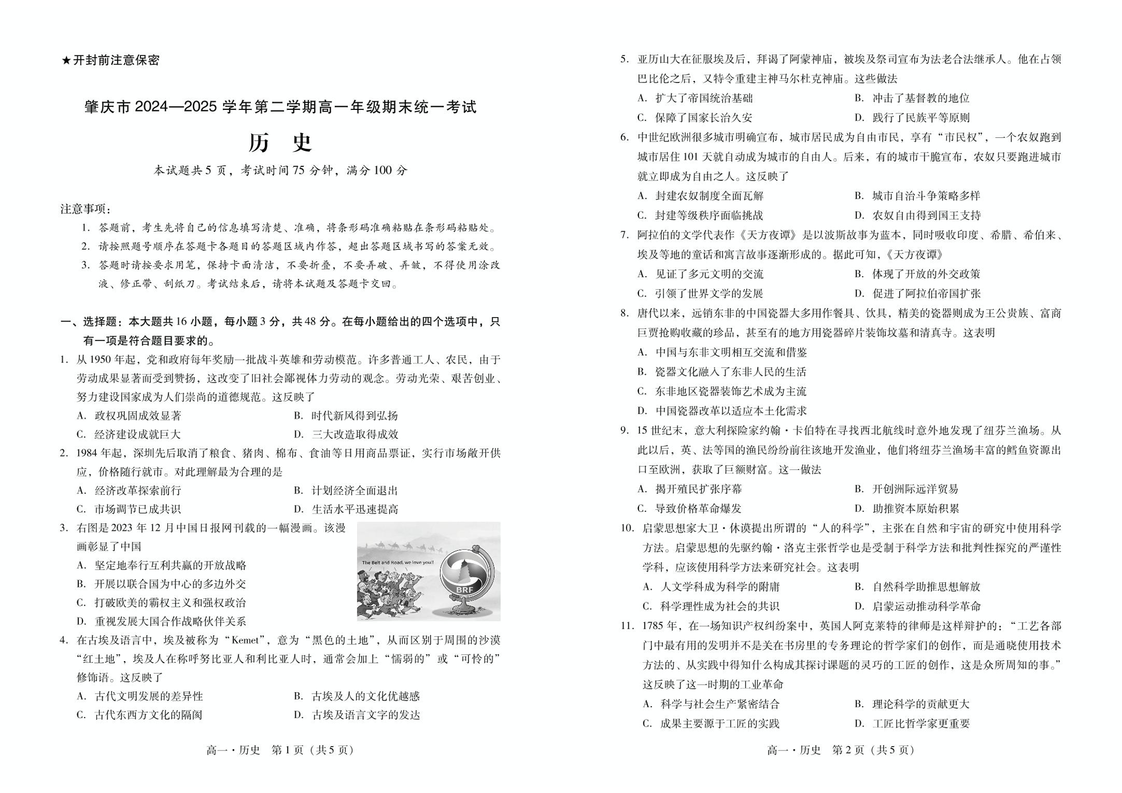 高一历史+答案--广东省肇庆市2024-2025学年高一下学期期末考试