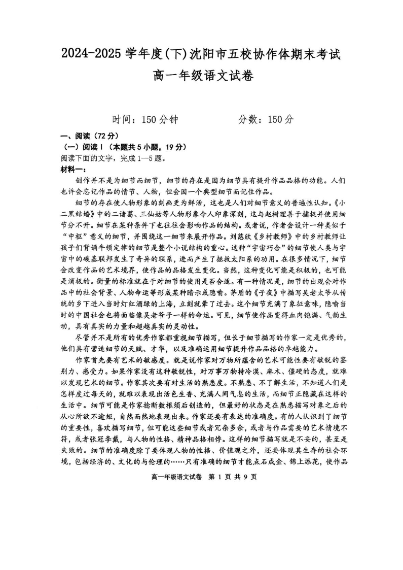 高一语文+答案--辽宁省沈阳市五校协作体2024-2025学年度高一下学期期末考试