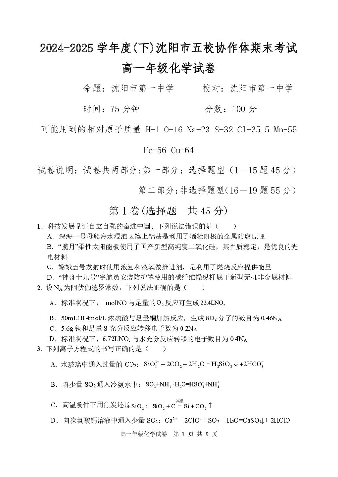 高一化学+答案--辽宁省沈阳市五校协作体2024-2025学年度高一下学期期末考试