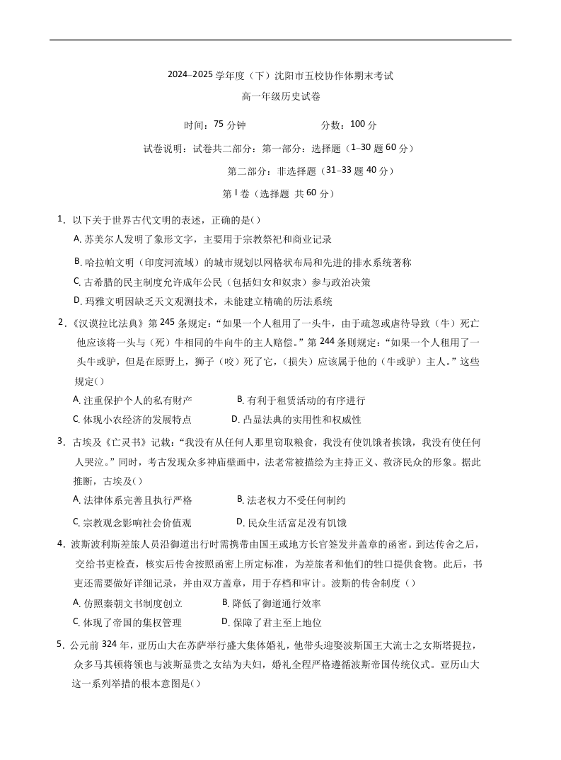 高一历史+答案--辽宁省沈阳市五校协作体2024-2025学年度高一下学期期末考试