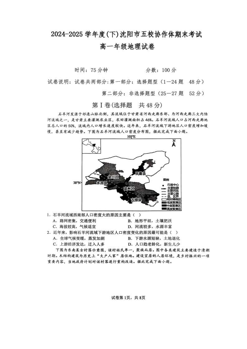 高一地理+答案--辽宁省沈阳市五校协作体2024-2025学年度高一下学期期末考试