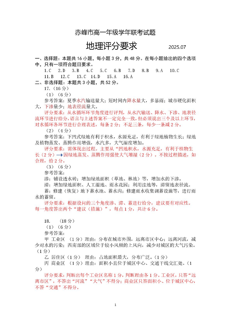 高一地理答案--内蒙古赤峰市2024-2025学年高一下学期期末联考