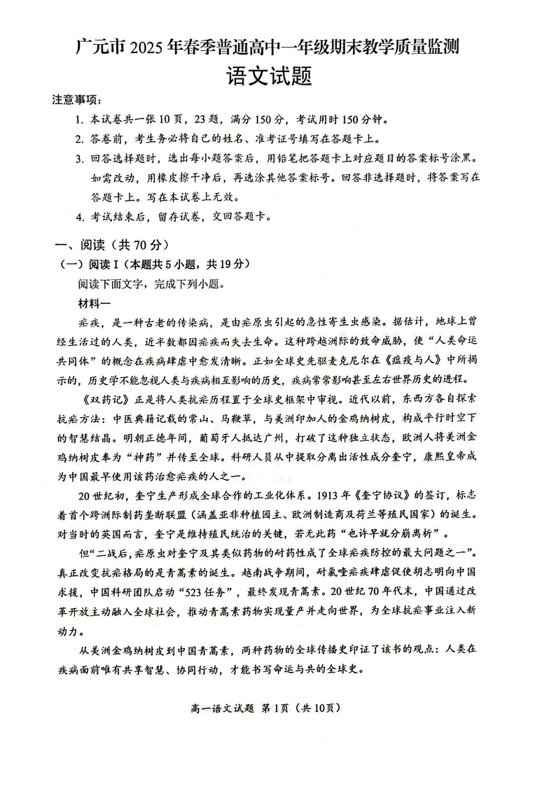 高一语文+答案--四川省广元市2025年春季普通高中一年级期末教学质量监测