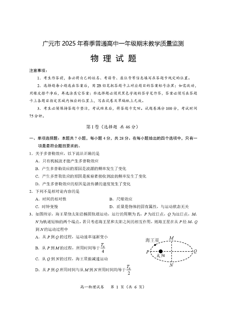 高一物理+答案--四川省广元市2025年春季普通高中一年级期末教学质量监测