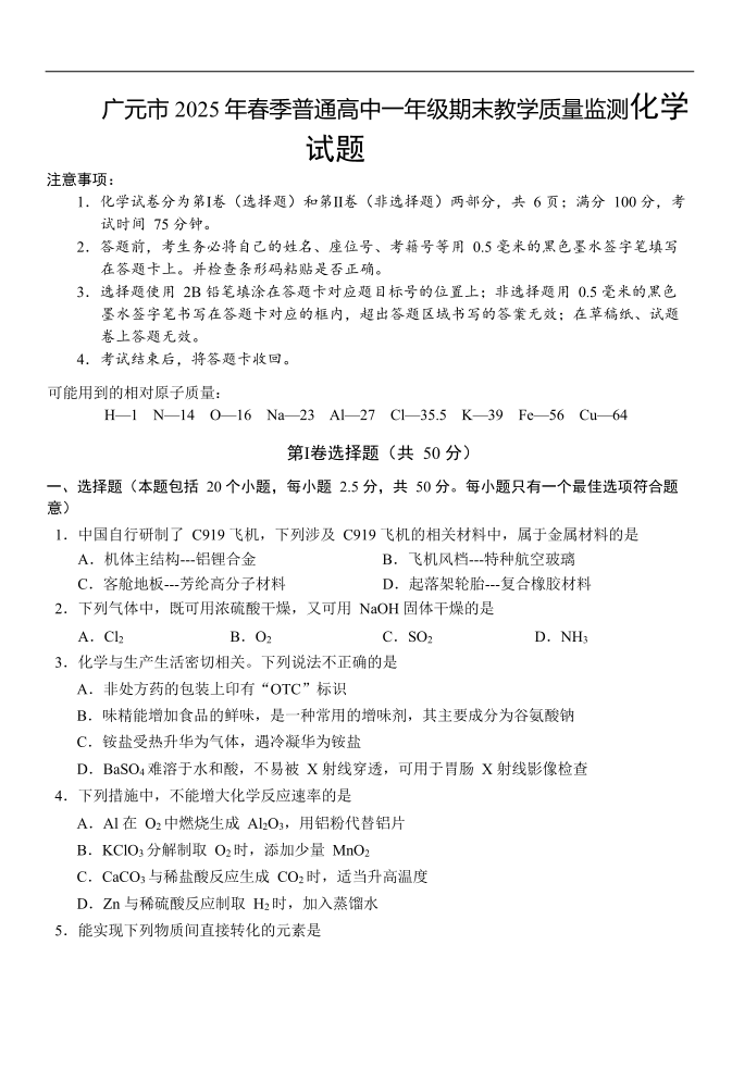 高一化学--四川省广元市2025年春季普通高中一年级期末教学质量监测