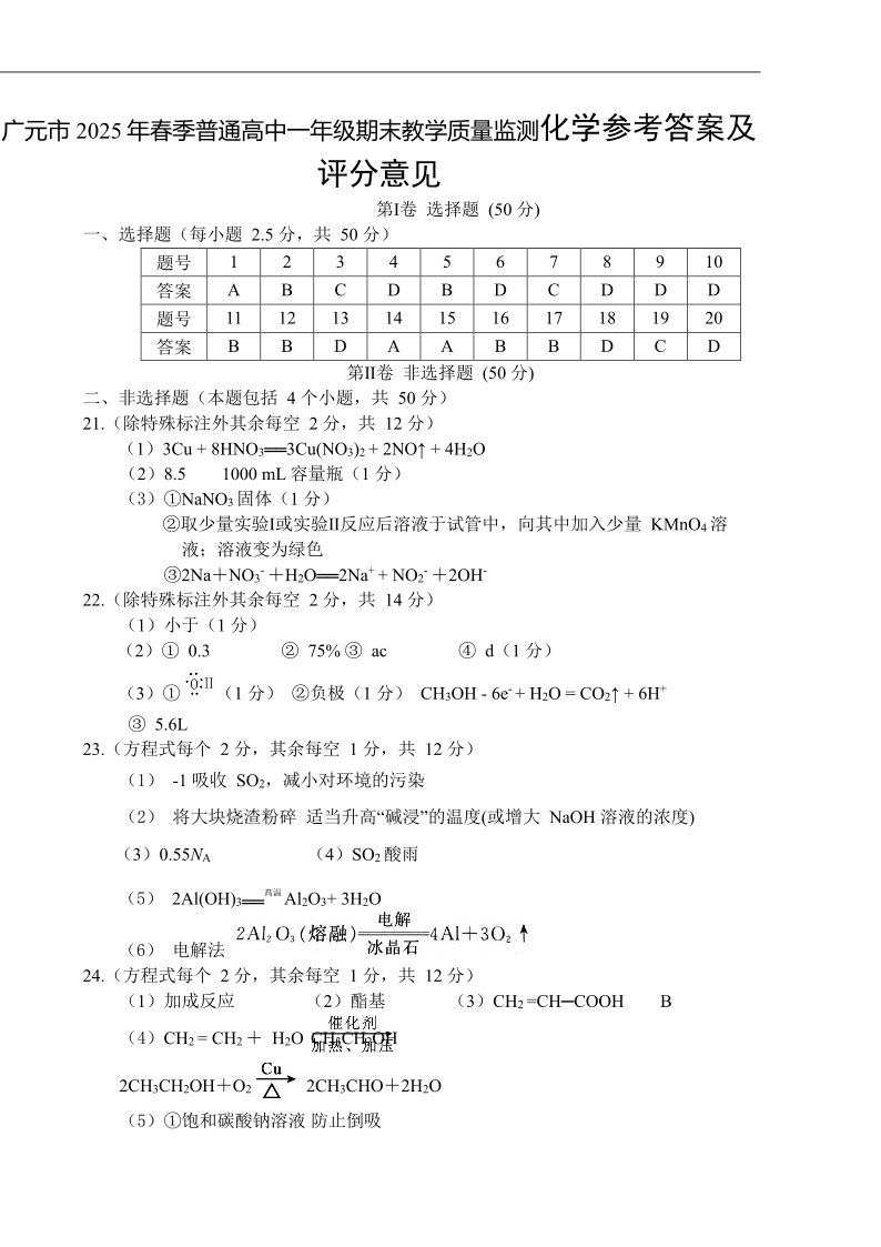 高一化学答案--四川省广元市2025年春季普通高中一年级期末教学质量监测