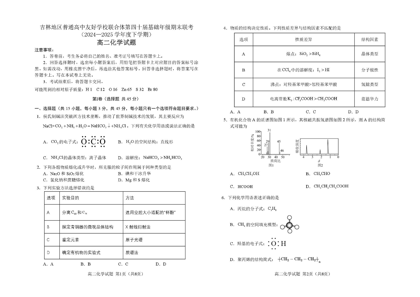 高二化学--吉林地区普通高中友好学校联合体2024-2025学年高二下学期期末考试