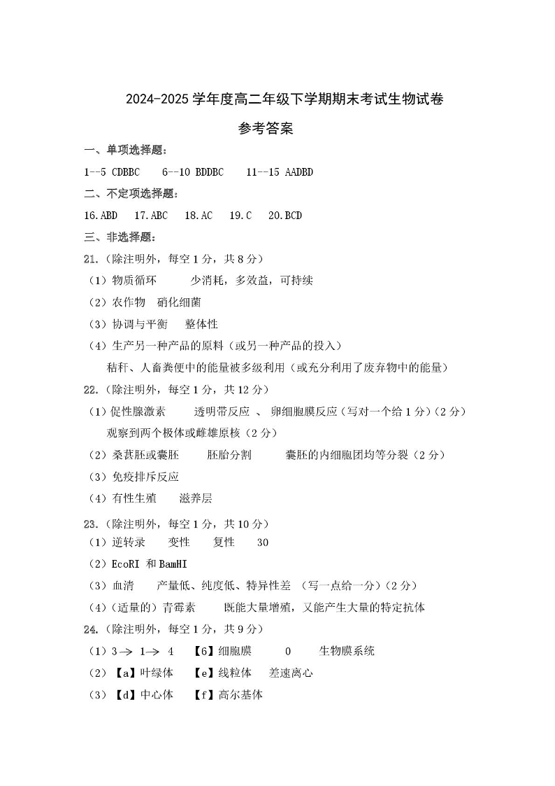 高二生物答案--吉林地区普通高中友好学校联合体2024-2025学年高二下学期期末考试