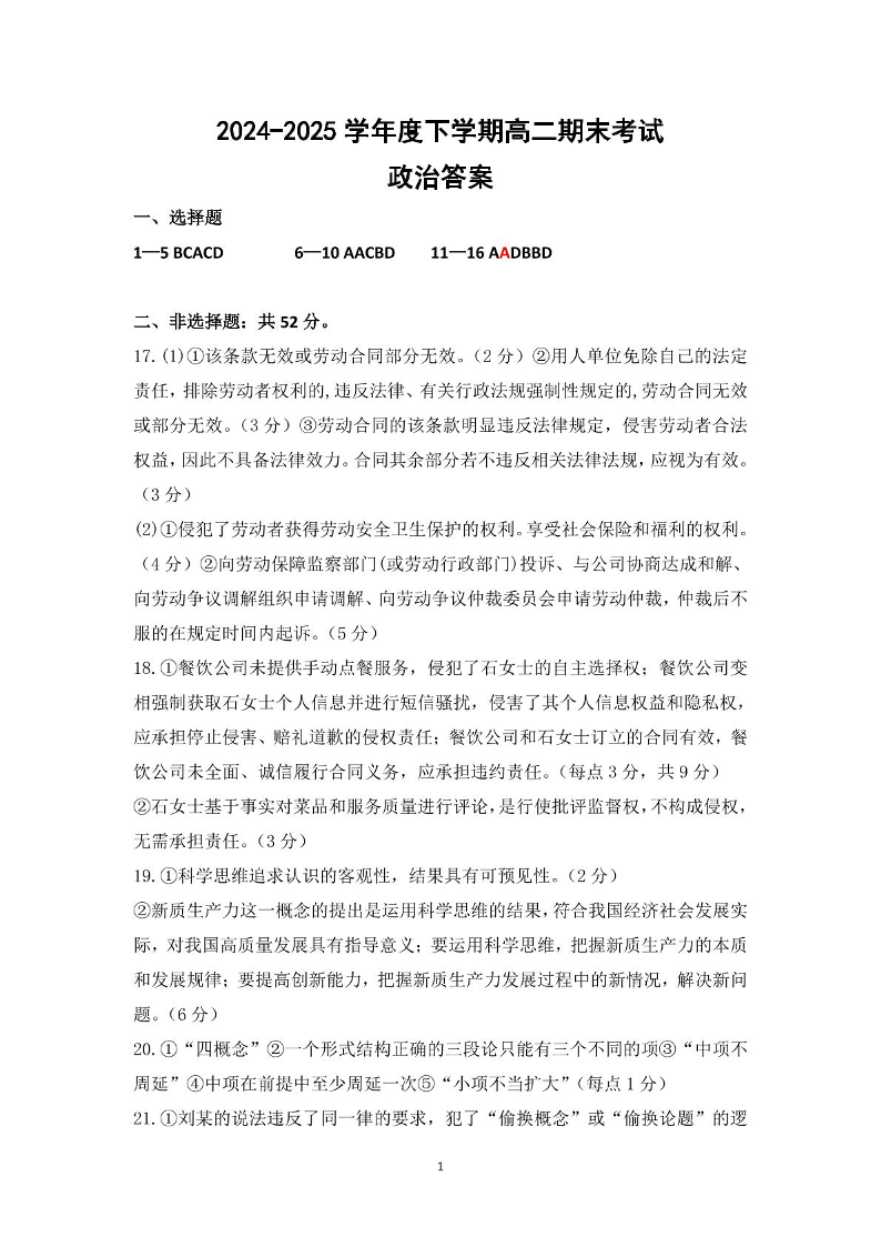 高二政治答案--吉林地区普通高中友好学校联合体2024-2025学年高二下学期期末考试