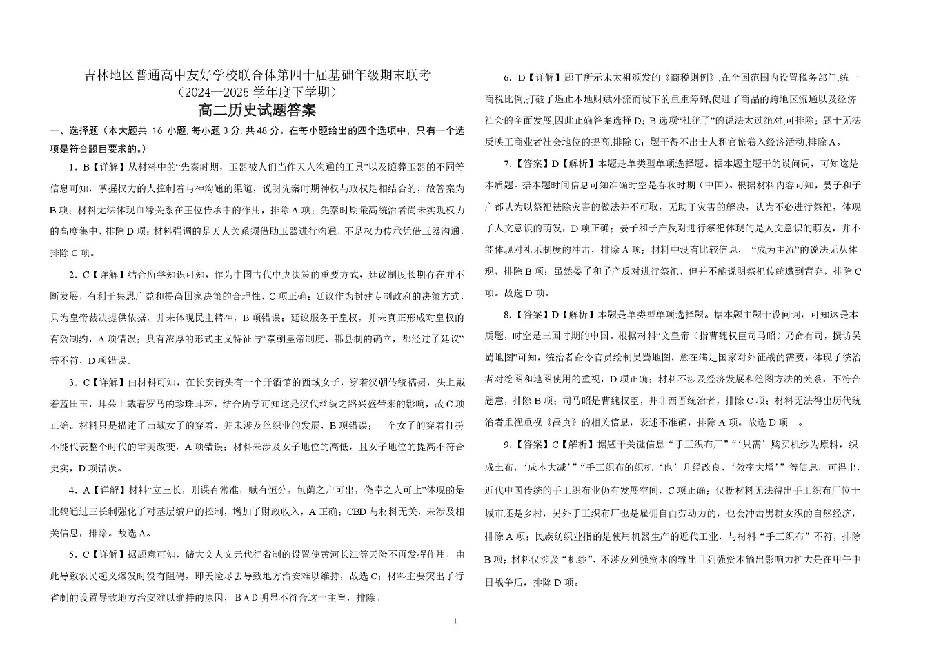 高二历史答案--吉林地区普通高中友好学校联合体2024-2025学年高二下学期期末考试