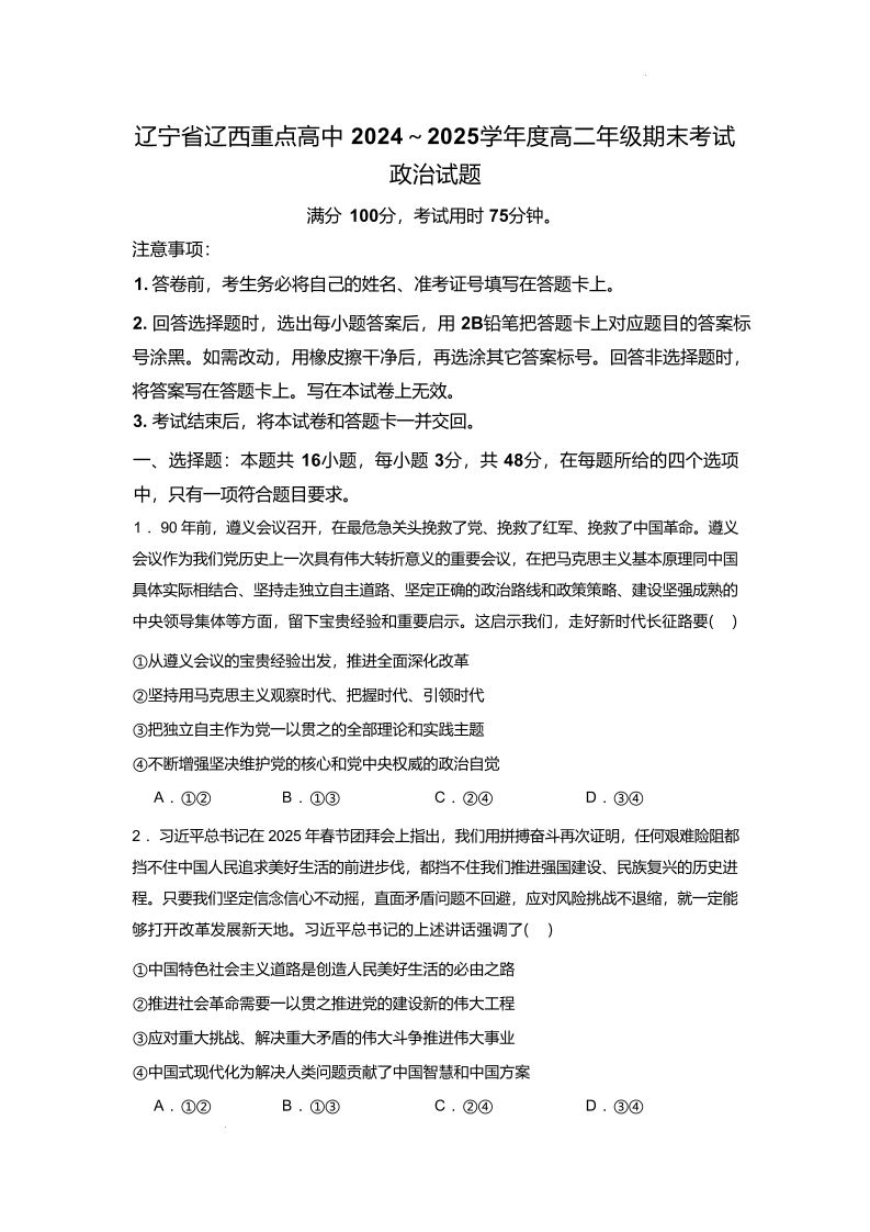 高二政治+答案--辽宁省辽西重点高中2024-2025学年高二下学期7月期末考试
