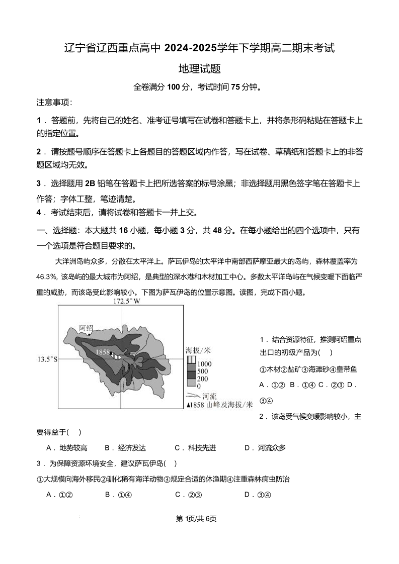 高二地理+答案--辽宁省辽西重点高中2024-2025学年高二下学期7月期末考试