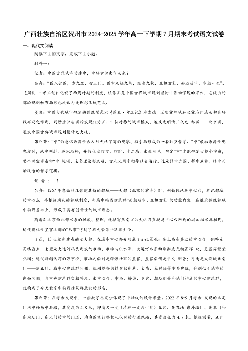 高一语文+答案--广西省贺州市2024-2025学年高一下学期金太阳期末教学质量监测