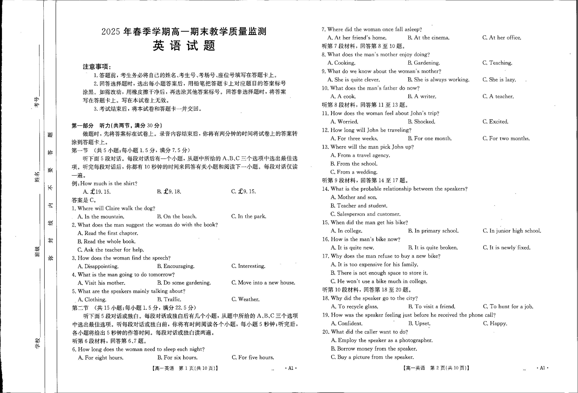 高一英语+答案--广西省贺州市2024-2025学年高一下学期金太阳期末教学质量监测