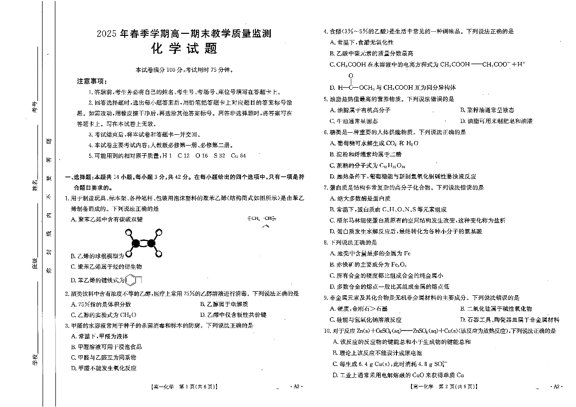 高一化学+答案--广西省贺州市2024-2025学年高一下学期金太阳期末教学质量监测