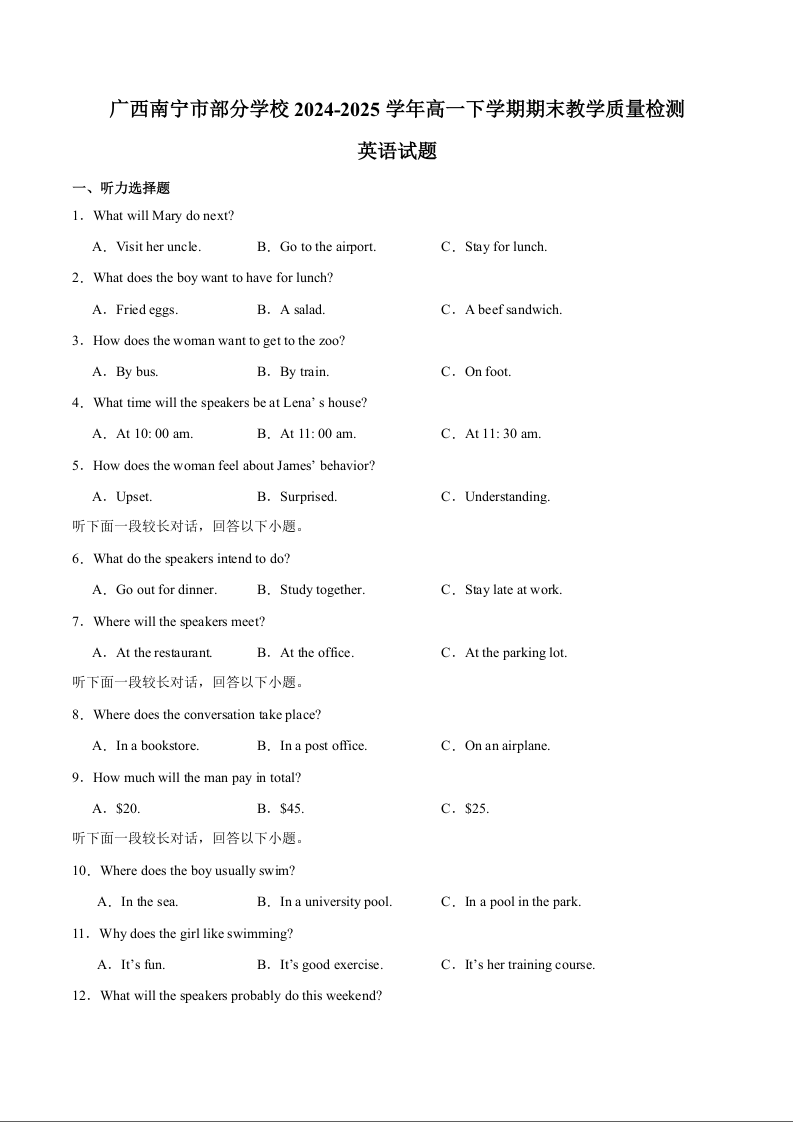 高一英语+答案--广西省南宁市2024-2025学年高一下学期金太阳期末教学质量监测