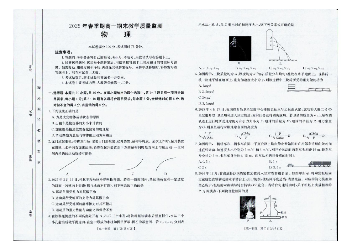 高一物理--广西省南宁市2024-2025学年高一下学期金太阳期末教学质量监测