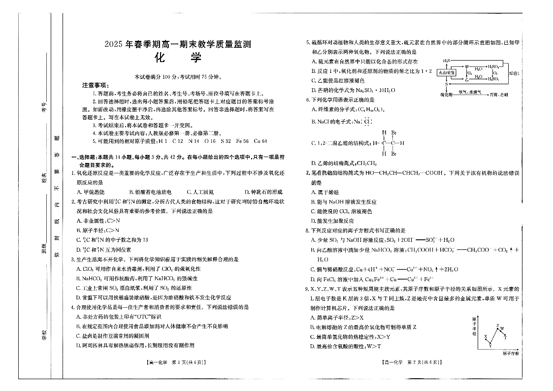 高一化学+答案--广西省南宁市2024-2025学年高一下学期金太阳期末教学质量监测