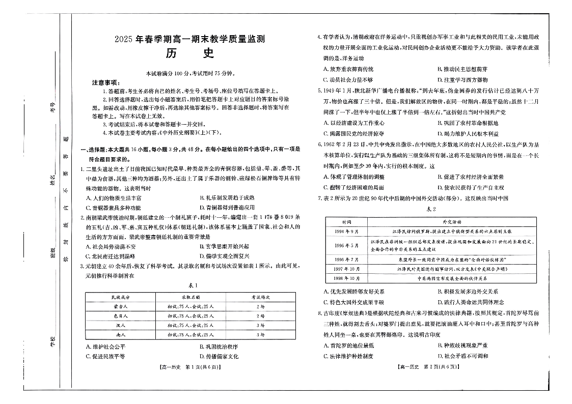 高一历史+答案--广西省南宁市2024-2025学年高一下学期金太阳期末教学质量监测