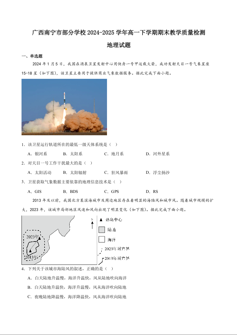 高一地理+答案--广西省南宁市2024-2025学年高一下学期金太阳期末教学质量监测