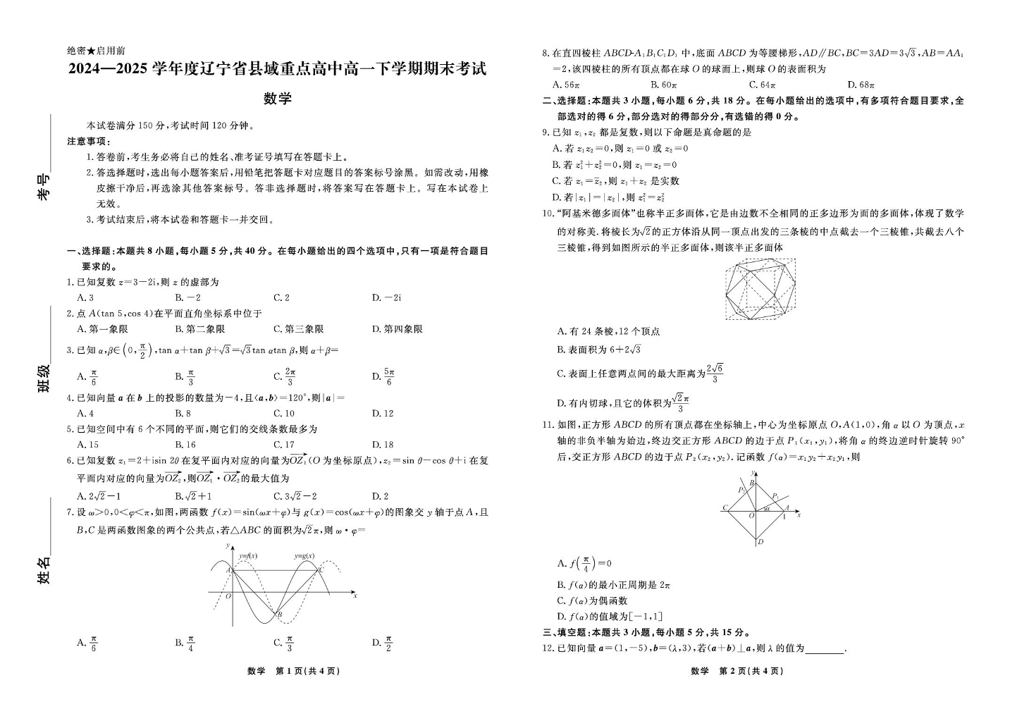 高一数学+答案--辽宁省县域重点高中2024-2025学年高一下学期期末考试