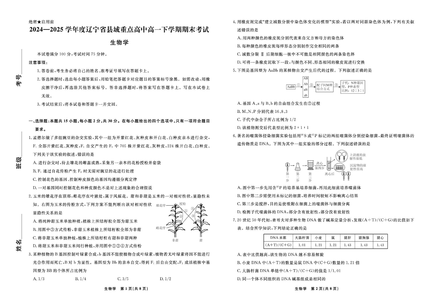 高一生物+答案--辽宁省县域重点高中2024-2025学年高一下学期期末考试
