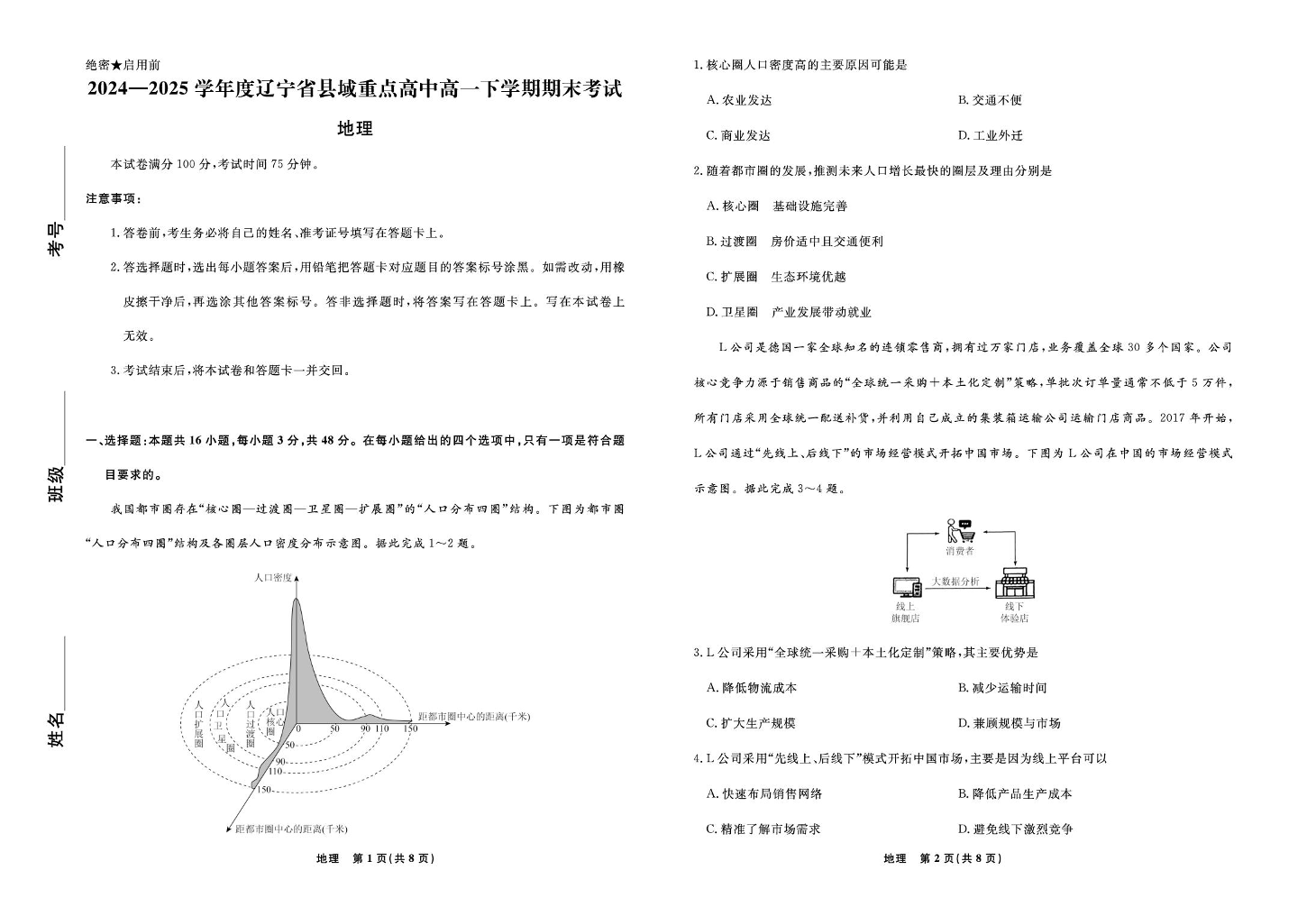 高一地理+答案--辽宁省县域重点高中2024-2025学年高一下学期期末考试