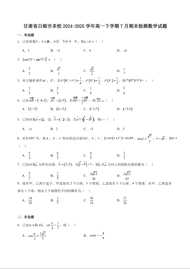 高一数学+答案--甘肃省白银市2024-2025学年高一下学期7月期末检测