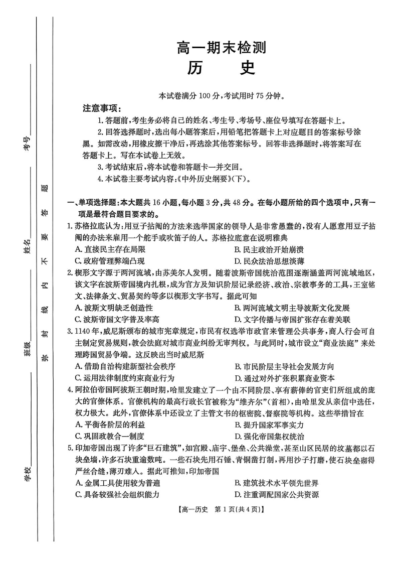 高一历史+答案--甘肃省白银市2024-2025学年高一下学期7月期末检测