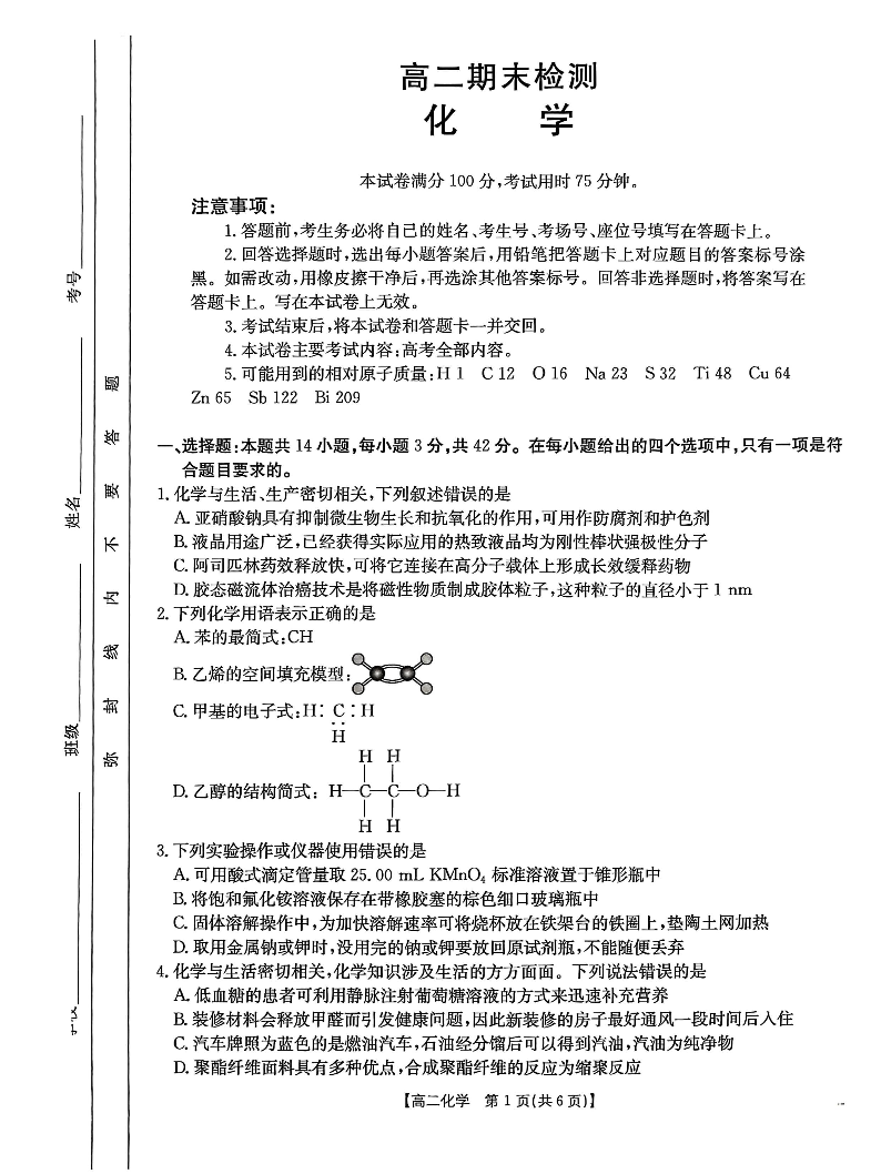 高二化学+答案--甘肃省白银市2024-2025学年高二下学期7月金太阳期末检测