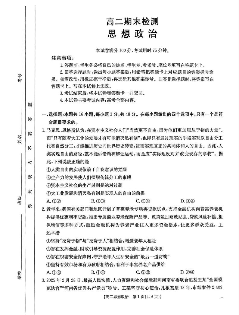 高二政治--甘肃省白银市2024-2025学年高二下学期7月金太阳期末检测