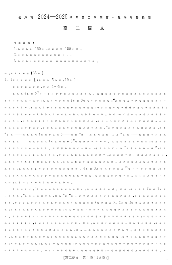 高二语文--广东省云浮市2024-2025学年高二下学期高中教学质量检测