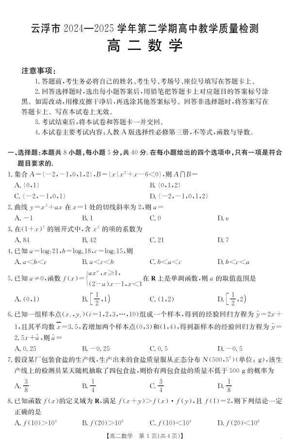 高二数学--广东省云浮市2024-2025学年高二下学期高中教学质量检测